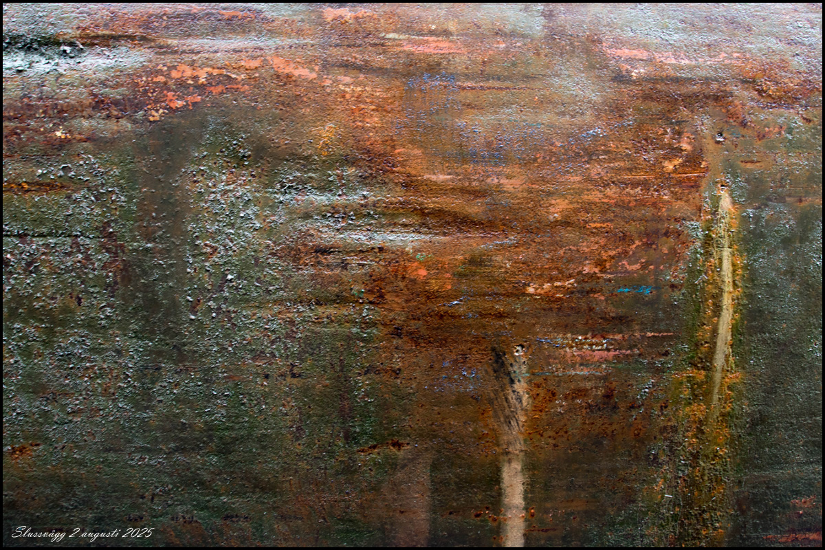 | Rost, alger och avskrapad målarfärg på slussväggen. | |