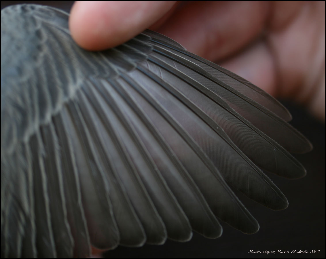 | Svart rödstjärt. Vingspets bildas av [3], 4 och 5, inskärning 3, 4, 5 och 6, hp2 lika med hp7. |