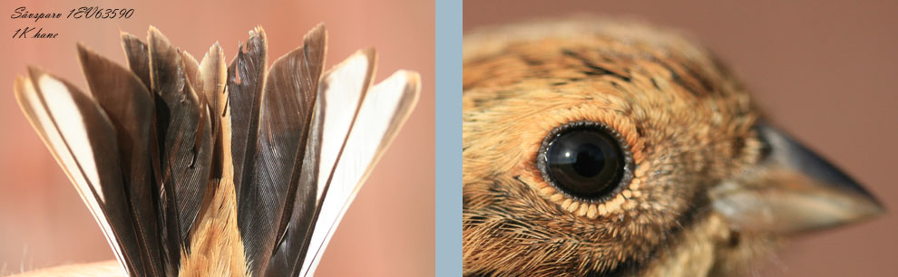 Den här sävsparven är en 2K+ hona med stjärtpenna 5 rund i spetsen. Iris har en brun touch som är svår att se på bilden. |