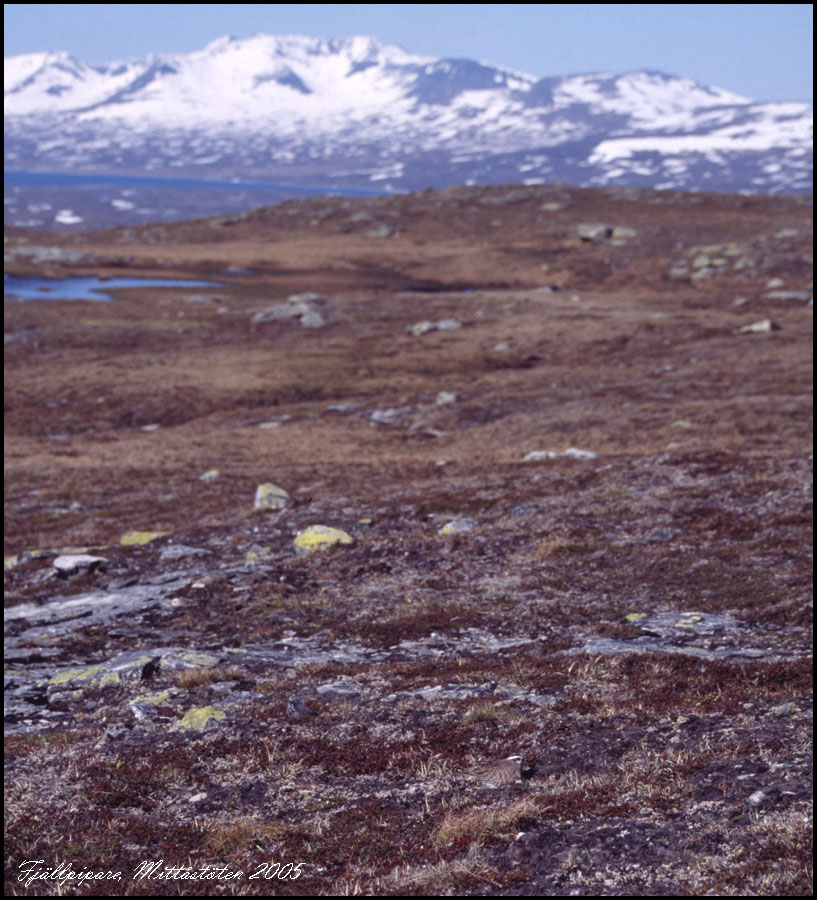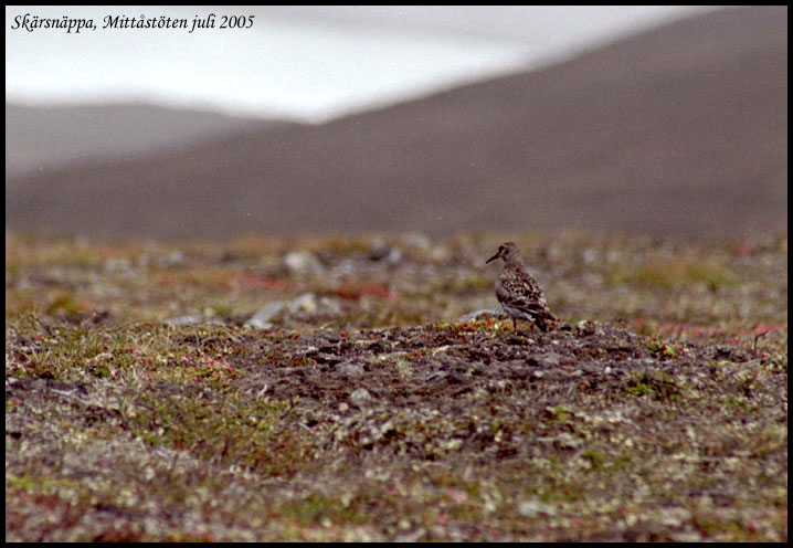Ruvande fjällpipare på Mittåstöten. Det är inte lätt att se fågeln. Den finns nära bildens nedre kant, något till höger om mitten. |