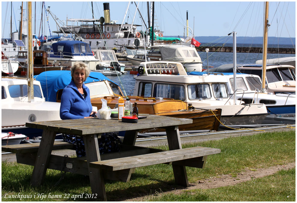 . Vi åkte hemifrån på morgonen och valde vägen via Vätterns västra sida. Vi tog lunchpaus i hamnen i Hjo.