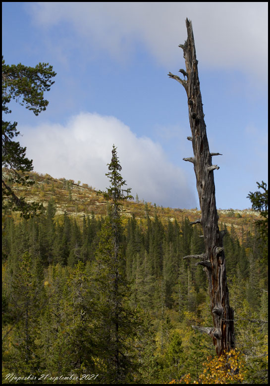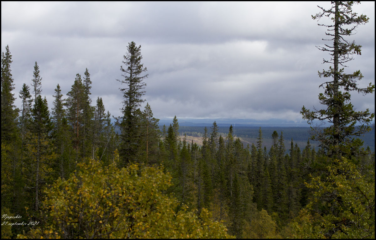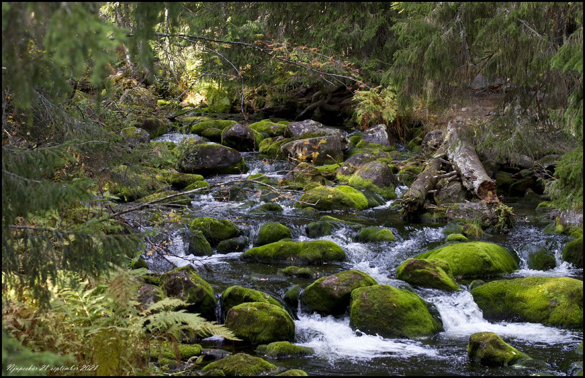 21 september. Efter övernattning åker vi vidare norrut, via Njupeskär. Det är en fin nationalpark med trevlig gammal skog. |