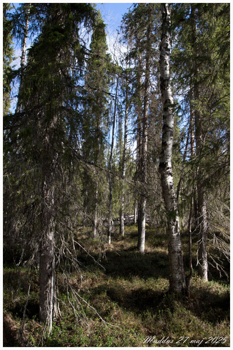 Den gamla skogen i Muddus nationalpark är sevärd. Vi övernattade på parkeringen till Muddus och gick en kort tur på kvällen.