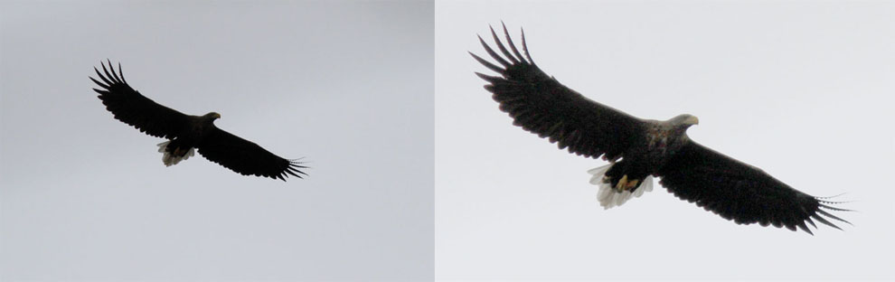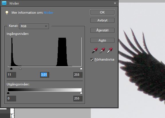 | Havsörnen kom närmre med ett stort ljust moln bakom sig. Exponeringen blev helt fel och originalet visar en nästan svart havsörn (bilden till vänster). Med nivåer kan man få fram delar av fågelns undersida. I diagrammet är reglaget för mellantoner draget långt till vänster. Nu syns undersidan mer men det blir inte en bild som man vinner fototävlingar med. |
