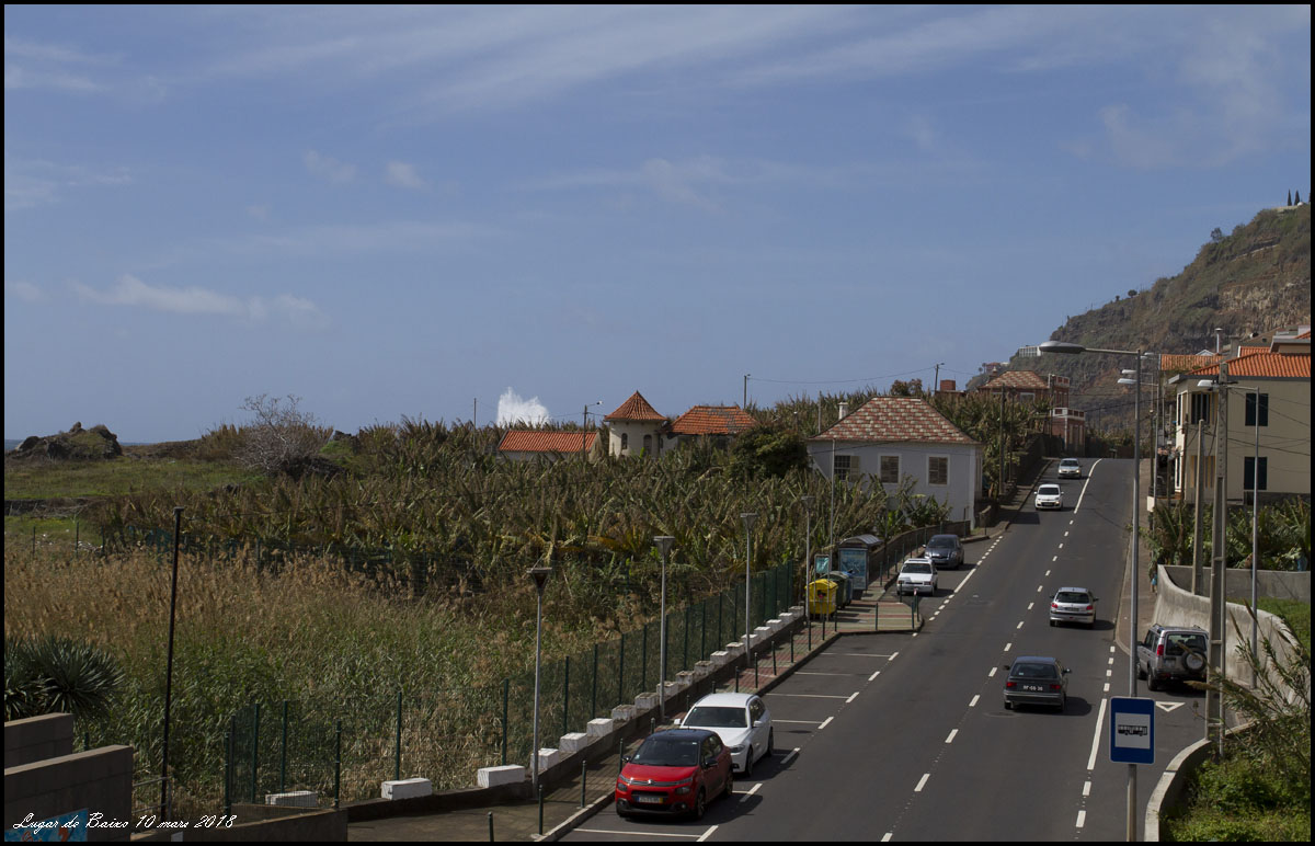 Vägen förbi Lugar de Baixo, i bakgrunden slår vågor