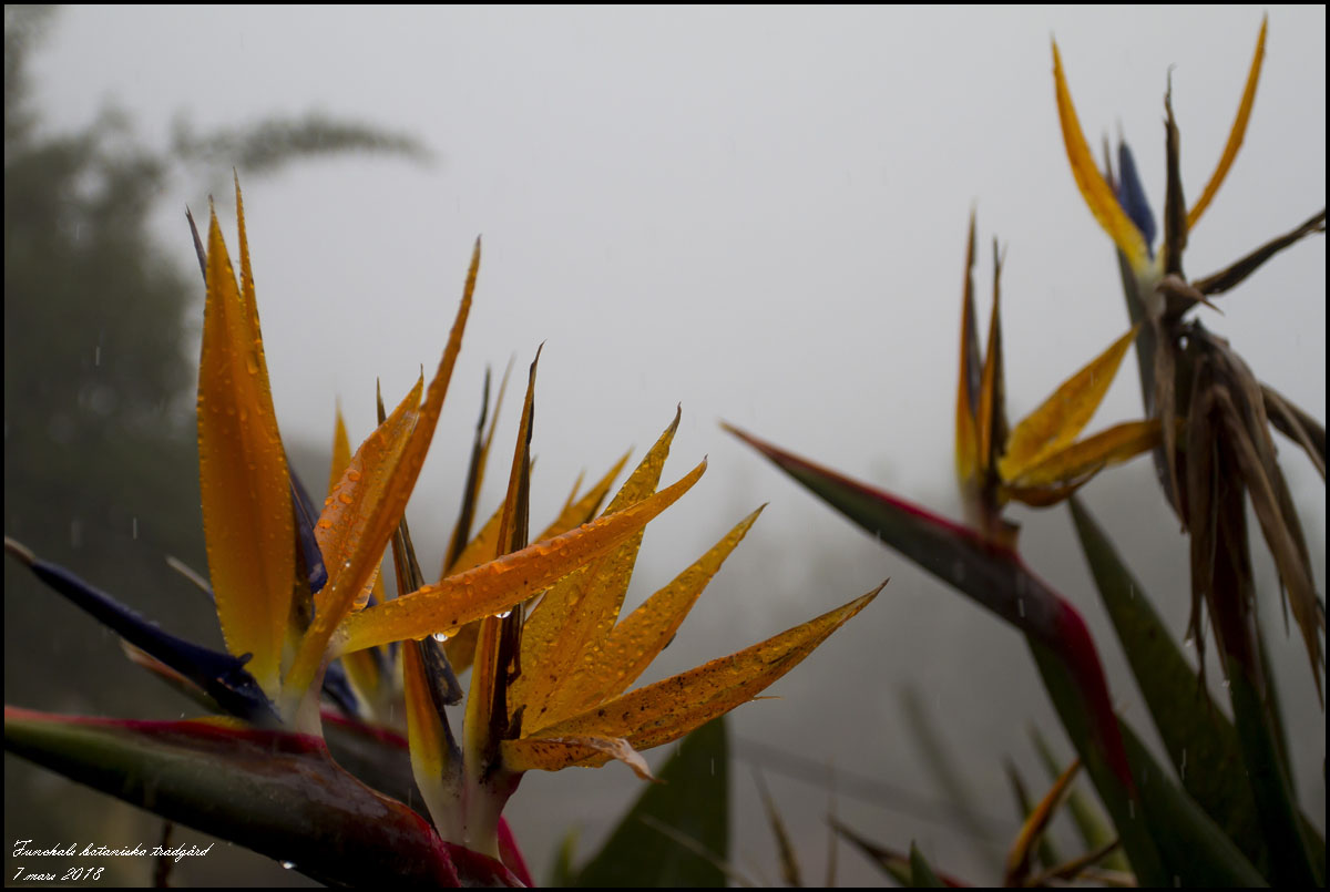 Vi tog oss till fots upp till Botaniska trädgården, det var jobbigt. Papegojnäbb i regnet