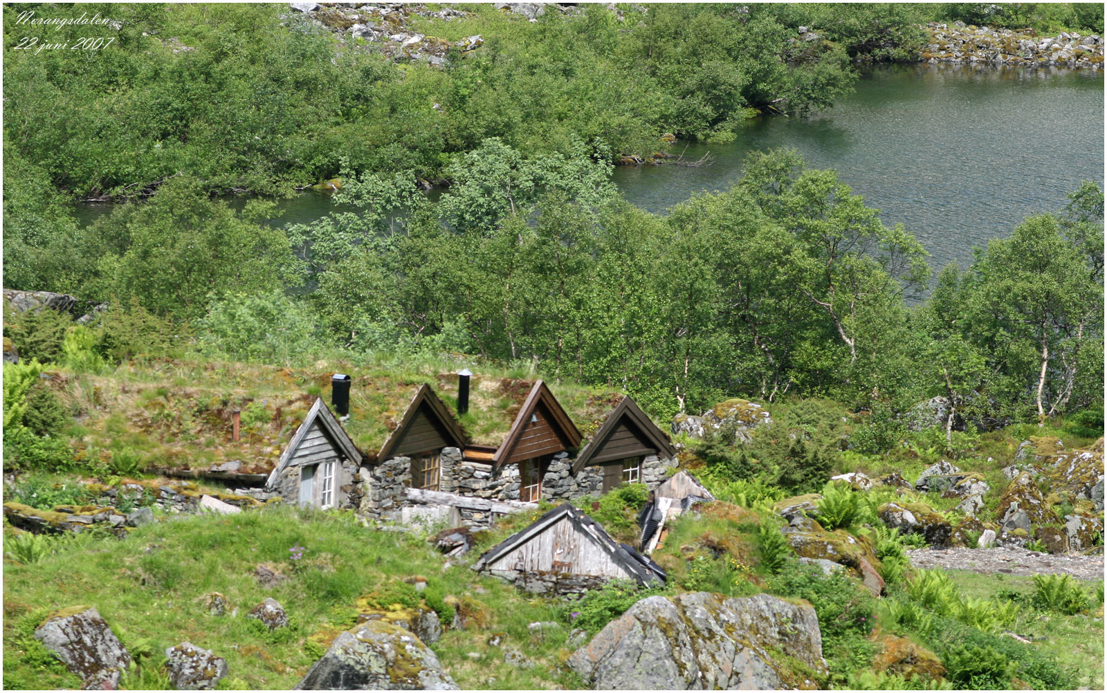 något till v'änster kan man ana några låga, gamla med torvtak