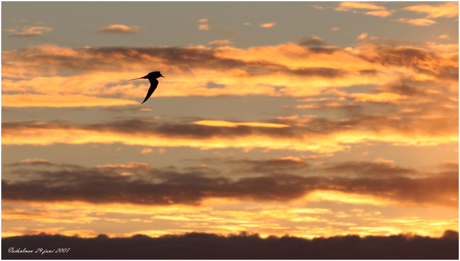 solens nedgång omkring halv tolv får natthimlen en rosa ton.