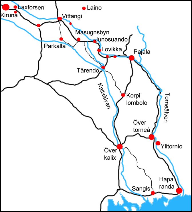 | Kartan visar några av platserna vi har besökt. Vi reste längs med Torneälven via Pajala till Haparande, Efter övernattningar i Sangis for vi norrut via Överkalix och Tärendö. | |