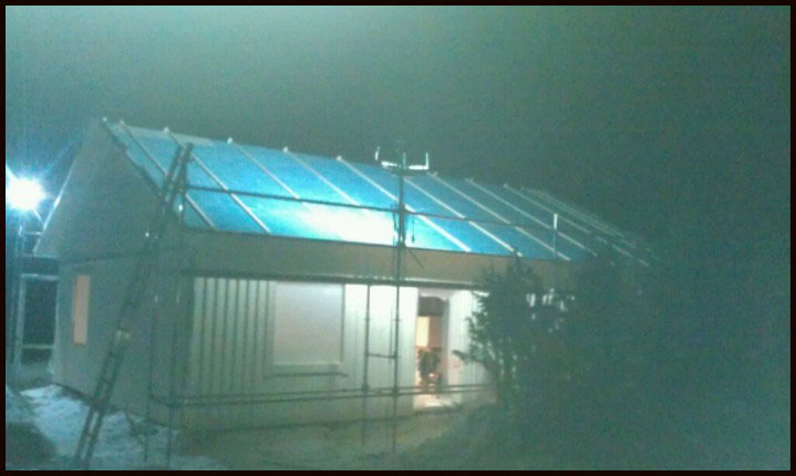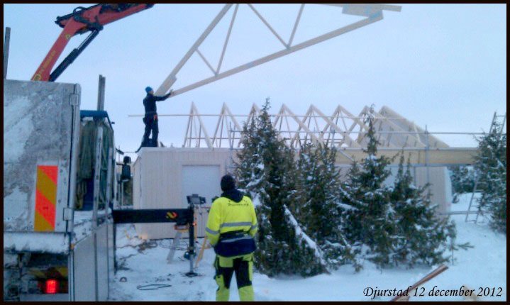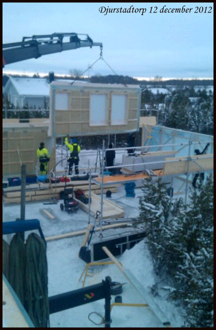 | Nu monteras huset på Öland! Gårdagens snöoväder har dragit vidare. Christian har tagit bilderna. Vi är tyvärr inte på plats. Det hade varit kul! Vi kör väl dit endera dagen. |