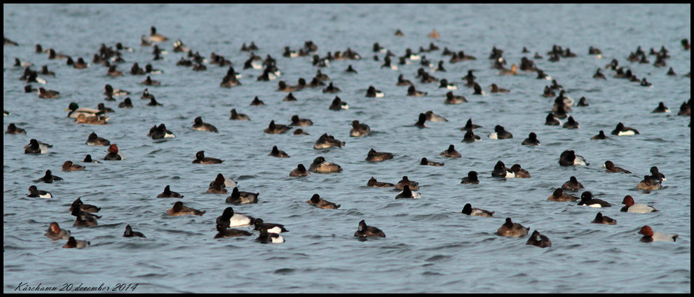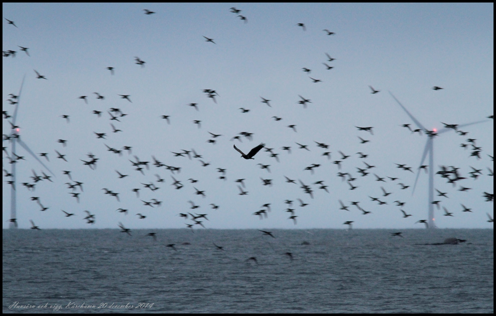 Sent på eftermiddagen gick jag ner till havet från Karse, norr om Kårehamn. Mängder av aythia-änder och andra. En havsörn fick de flesta på vingarna. |