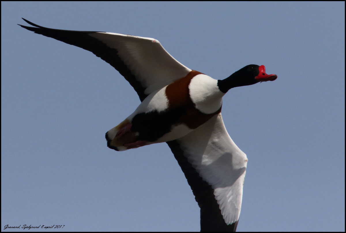 Två gravänder kom rakt emot oss. Autofokus hann med riktigt bra men fotografen hann inte med lika bra så vingspetsen hamnade utanför!