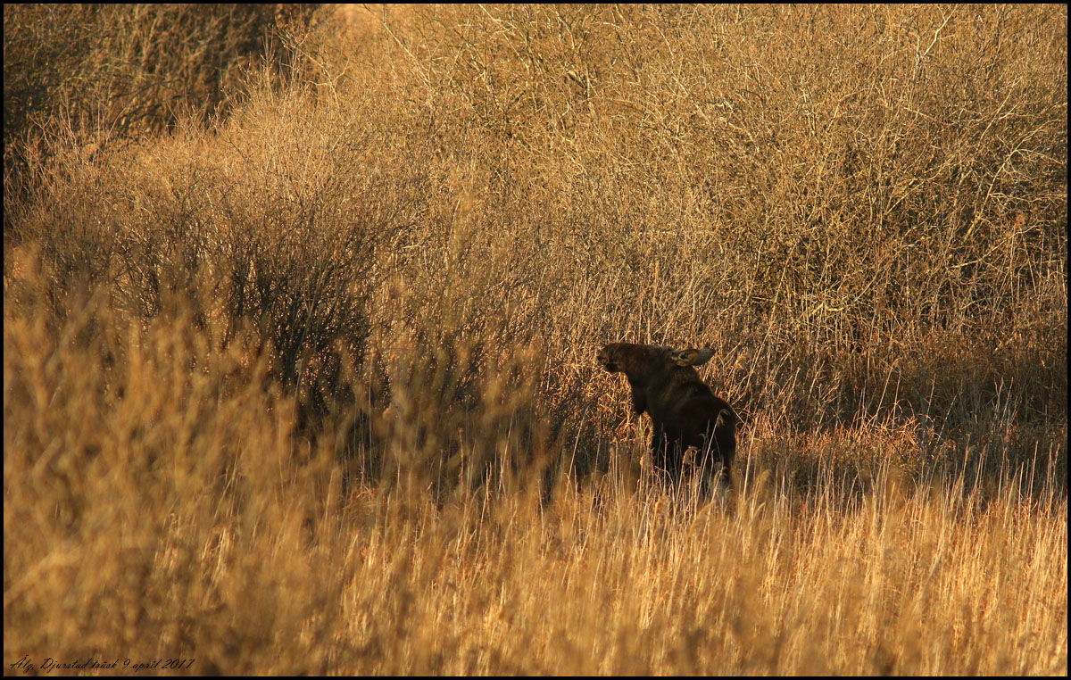 | 9 april. På kvällen tillbringade vi två timmar i tornet vid Djurstadsträsk. En älgfamilj betade norr om tornet. Kon var märkt med ett gult band och den ena kalven hade gröna märken i öronen. |