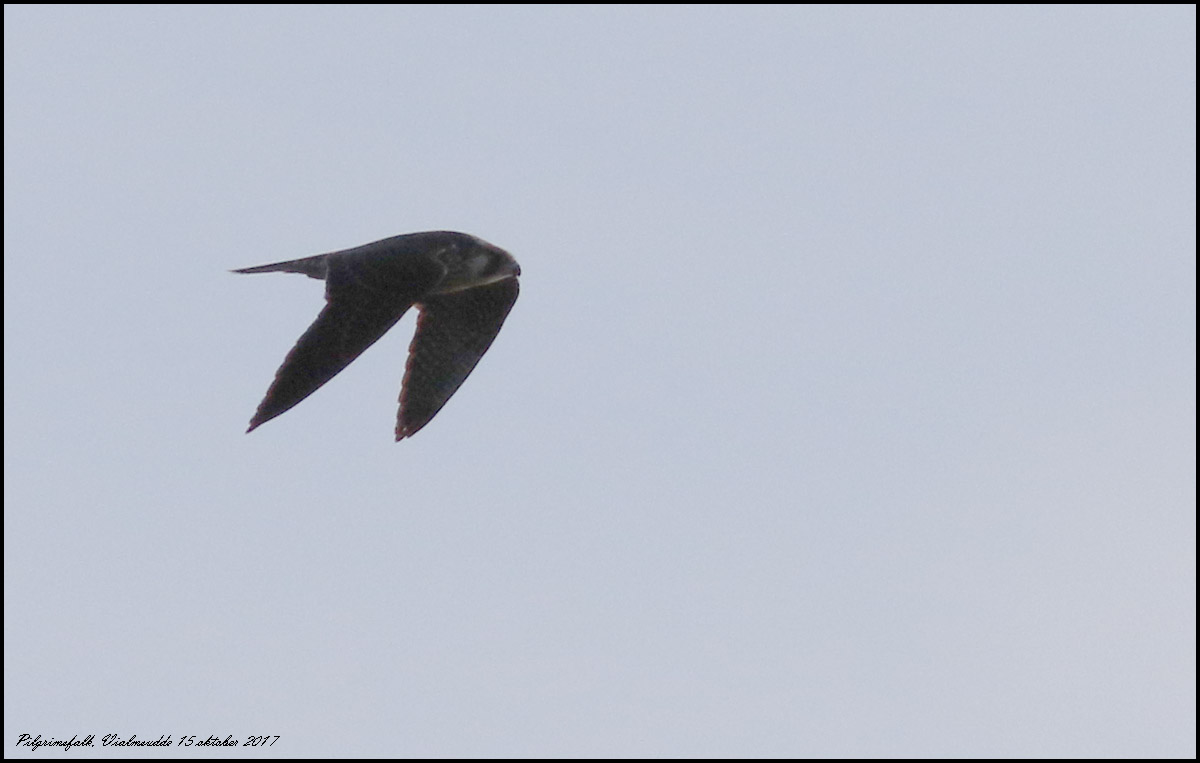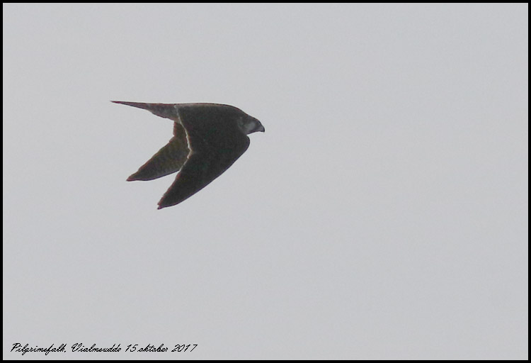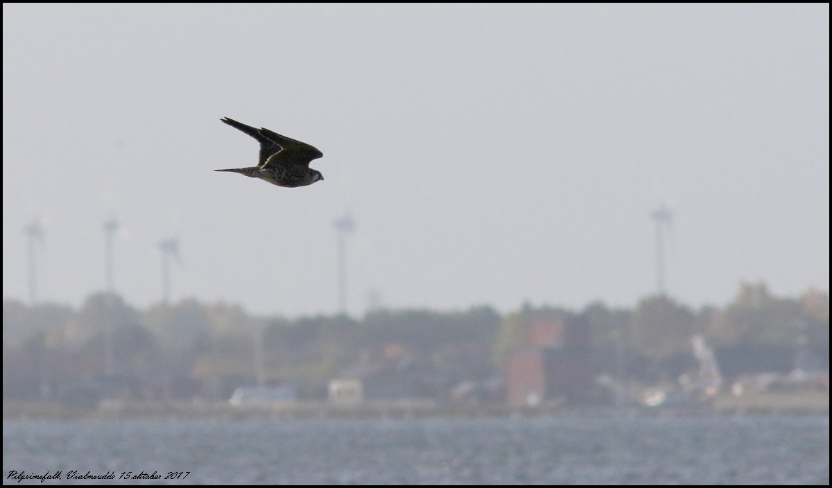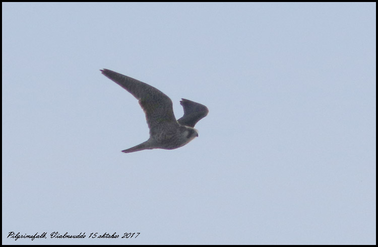 Fint och varmt väder med svaga vindar. En pilgrimsfalk jagade måsar på Sillgrund. Efter ett par misslyckade försök kom den förbi mig på sptesen av Vialms udde, tyvärr med solen bakom. |