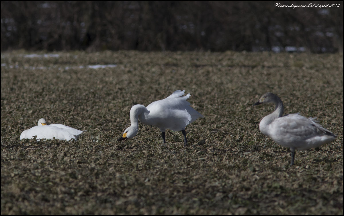2 april. Nu är vi på Öland igen! Sydväst om Löt hittade vi en flock sångsvanar som hade sällskap med några mindre sångsvanar |