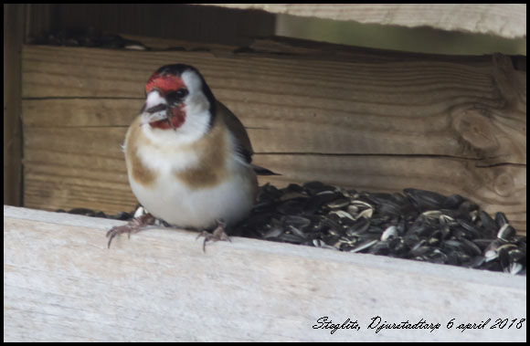| En steglits upptäckte fågelmatningen. Bilden är tagen genom treglasrutan. |