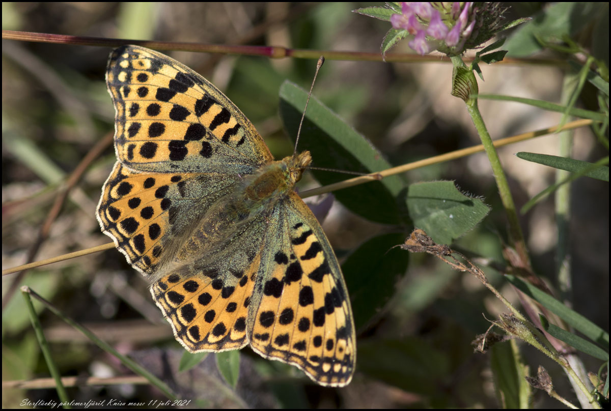 11 juli. Storfläckig pärlemorfjäril intill tornet vid Knisa mosse. Tornet är avstängt pga röta i en stolpe. |