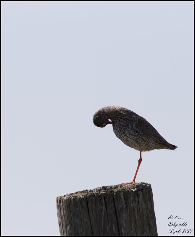 12 juli. Jag har besökt Egby udde. Gott om vadare rastade. Den här rödbenan satt på en stolpe intill vägen |