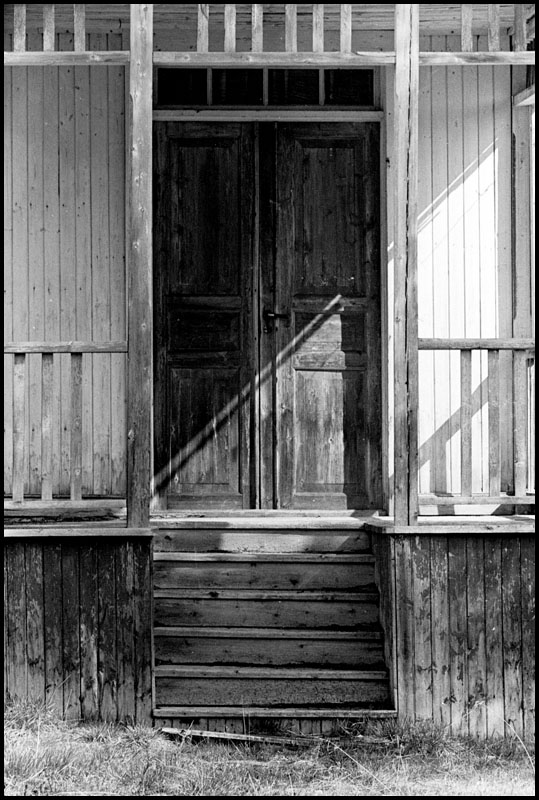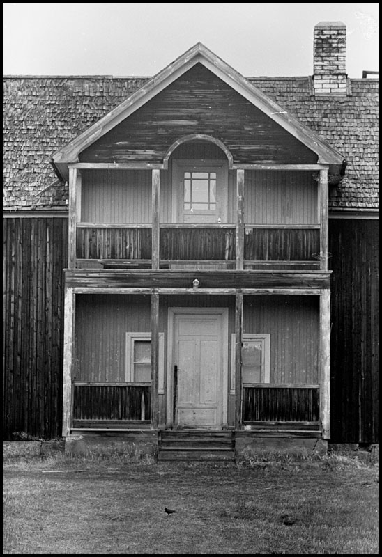 | Äldre byggnad i Rusksele. Två starar söker föda på gräsmattan framför huset. |
