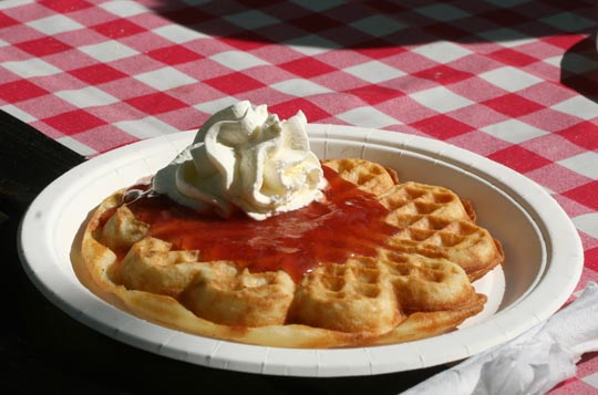 | Smaskigt med våffla, sylt och grädde. |