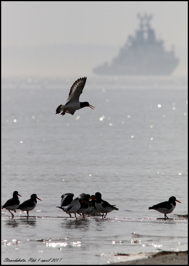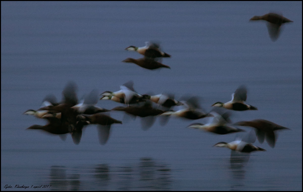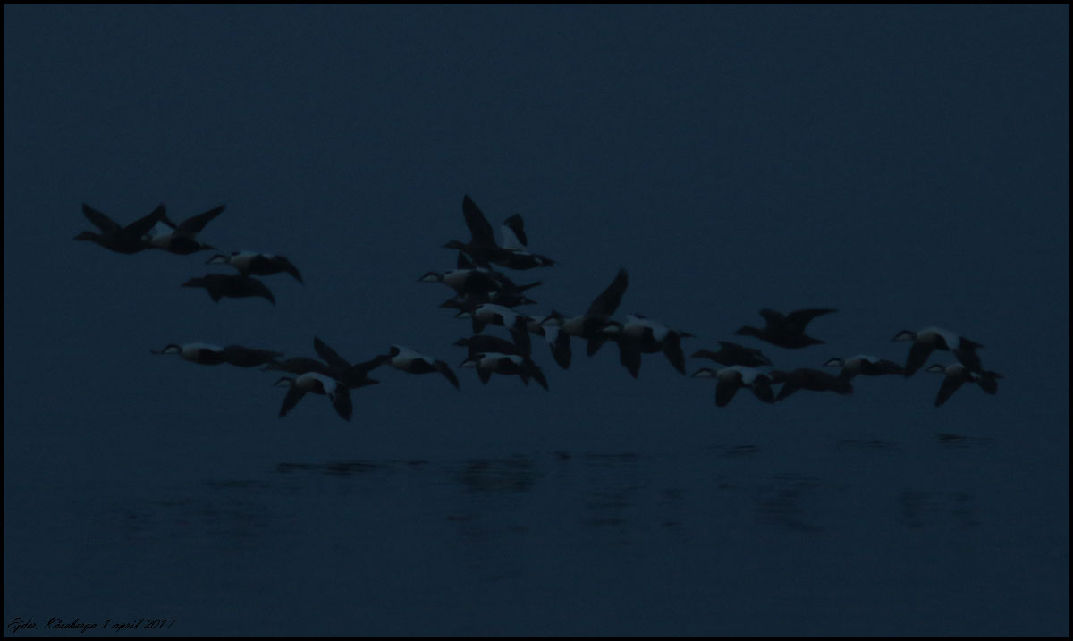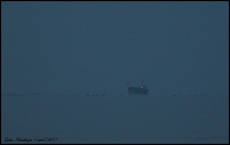 | Jag var på plats före klockan sex och då sågs ejder passera medan fiskarn i Kåseberga är på väg ut. |
