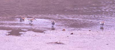 | Sydkusten vid Punta Roja. Längs strandlinjen sågs sandlöpare, större strandpipare, kustpipare och en småspov. |