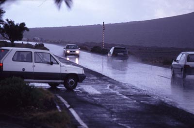 På öns torraste område, beskrivet som halvöken, började det regna. Det händer ungefär en dag vartannat år! |